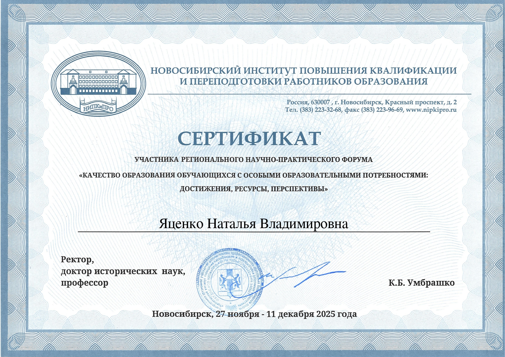 СЕРТИФИКАТ участника регионального научно-практического форума "Качество образования обучающихся с особыми образовательными потребностями: достижения, ресурсы, перспективы"